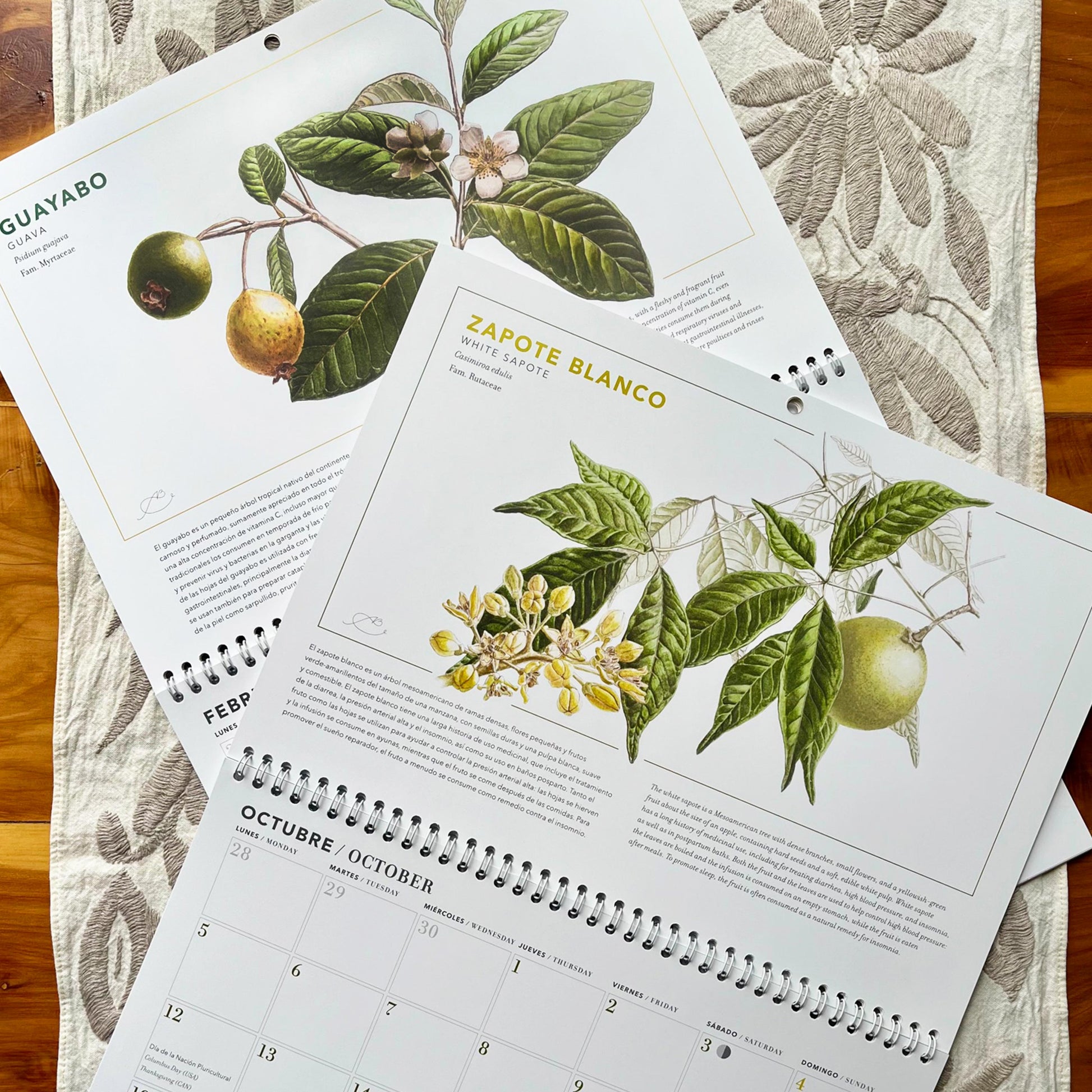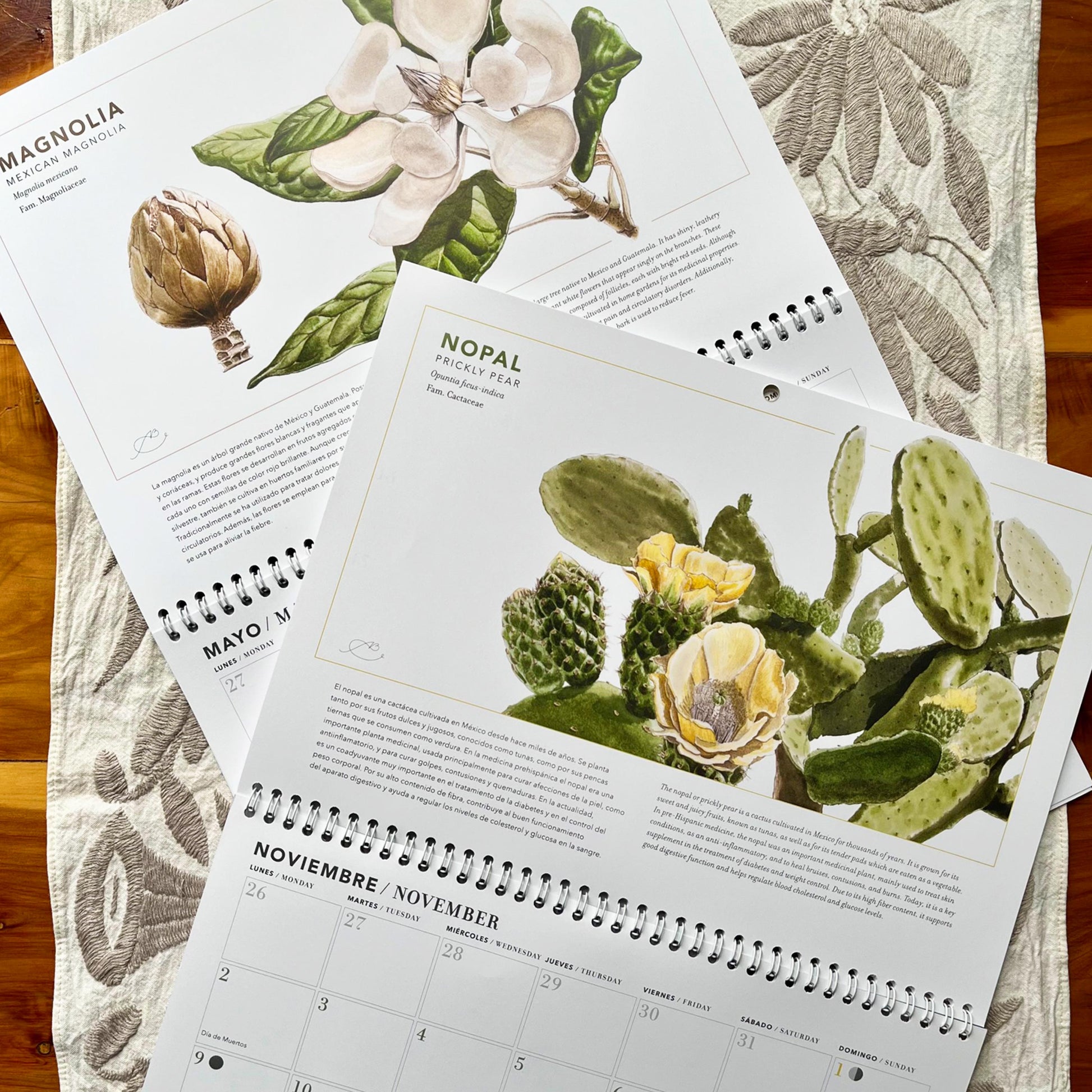 Edición bilingüe con feriados de México, Estados Unidos y Canadá + fases lunares + planilla de calcomanías botánicas.