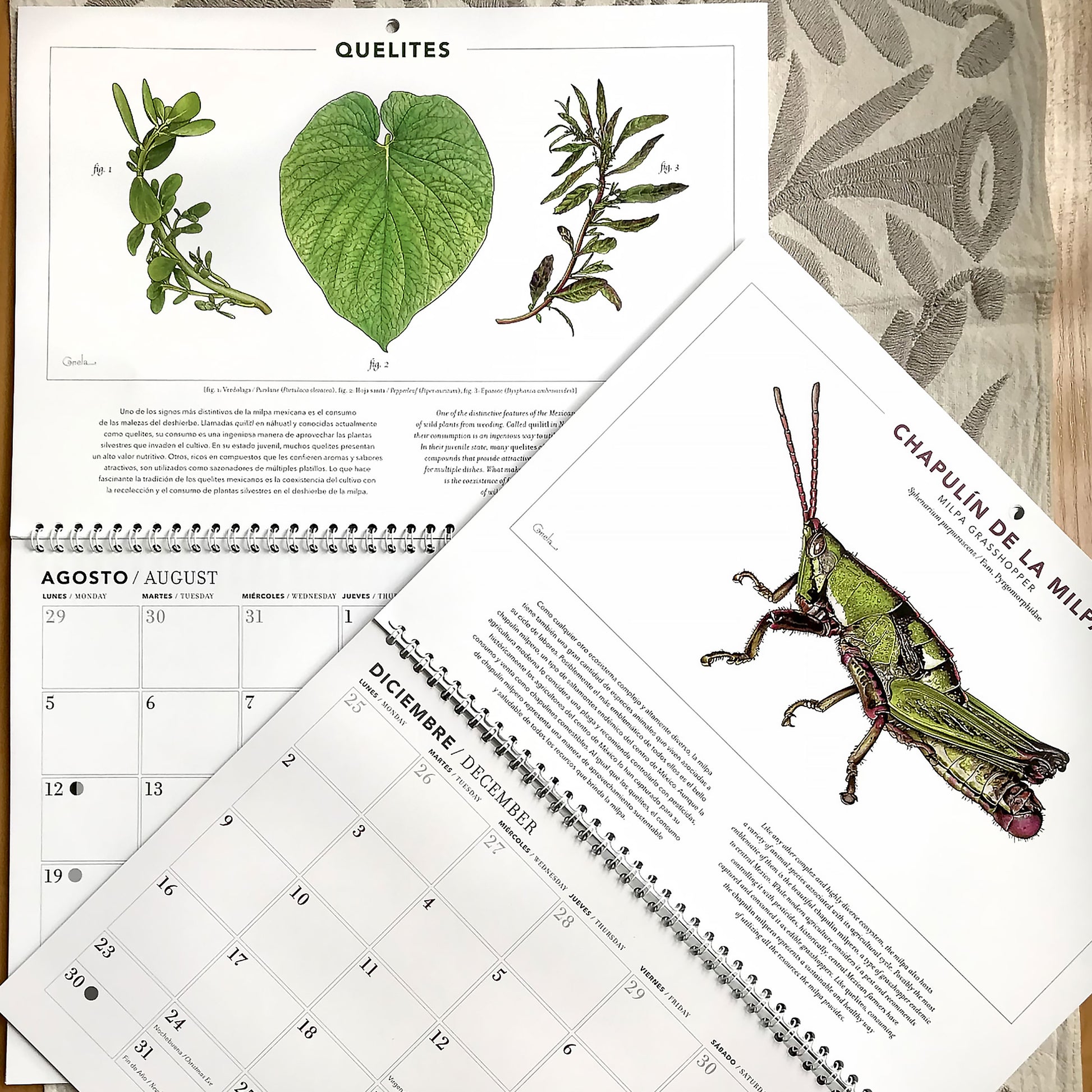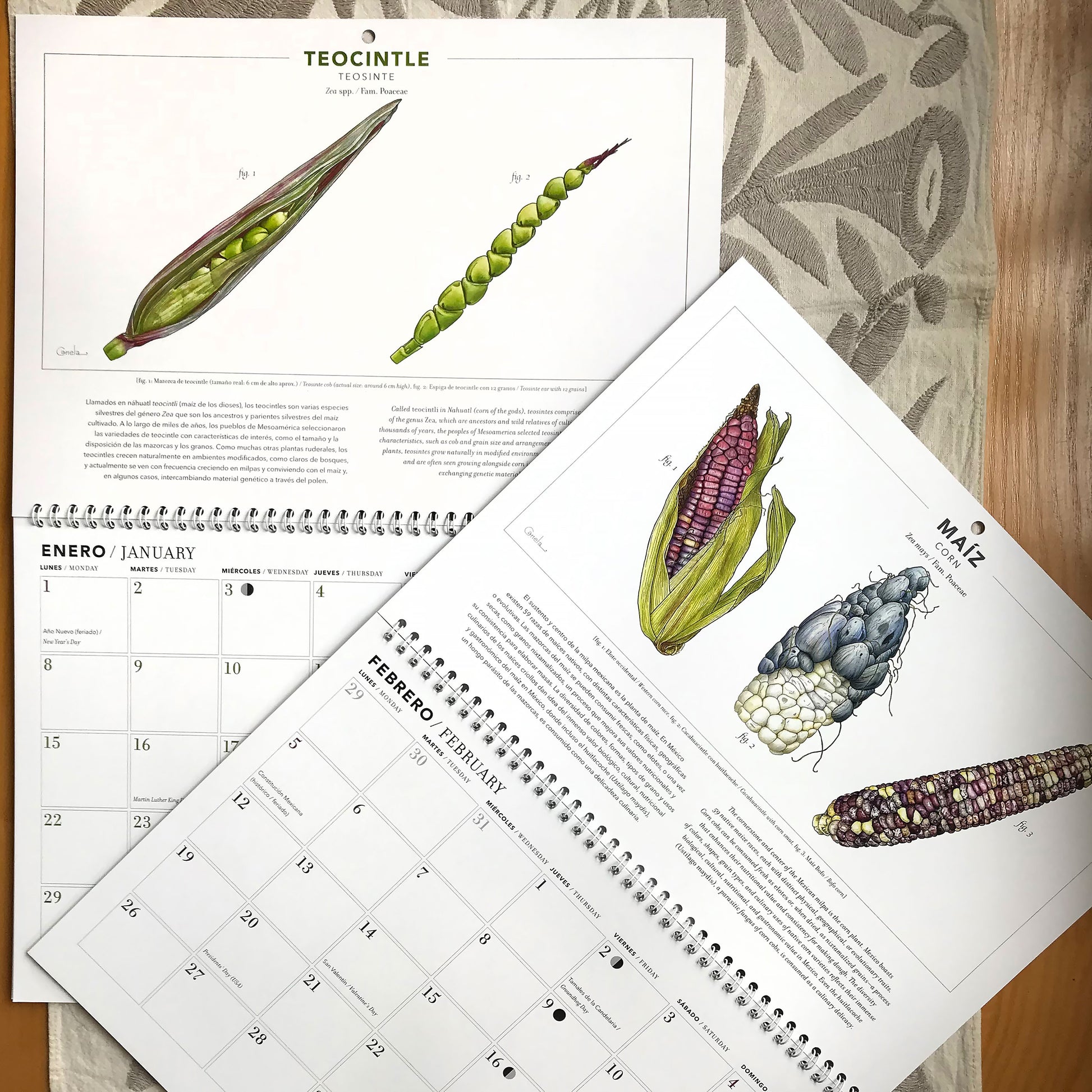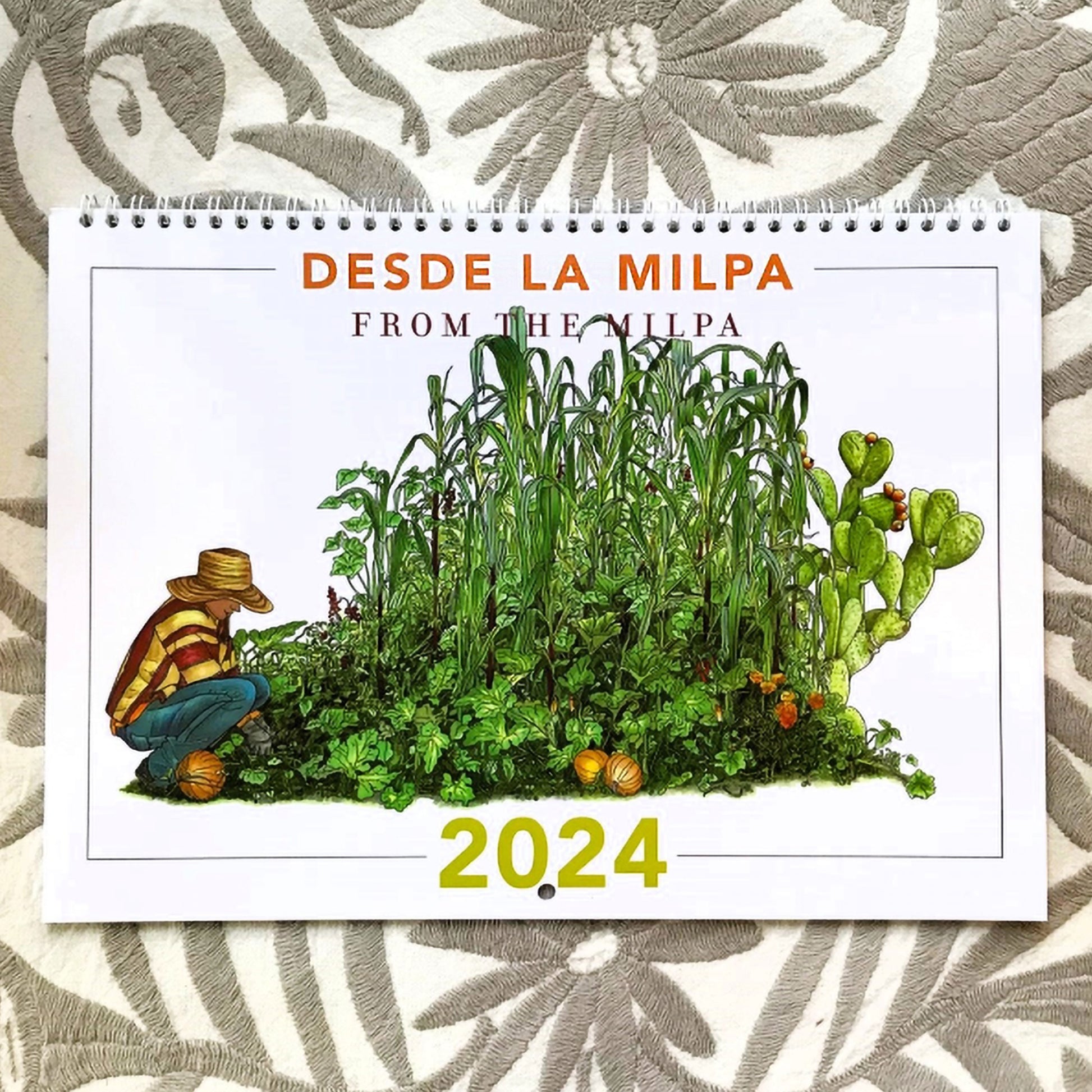 Calendario 2024 dedicado a la milpa mexicana con láminas botánicas de: teocintle, maíz, frijol, calabaza, chile, jitomate & jaltomate, tomatillo, quelites, maguey pulquero, nopal, flores silvestres y chapulín de la milpa / Edición bilingüe con feriados de México, Estados Unidos y Canadá + fases lunares.